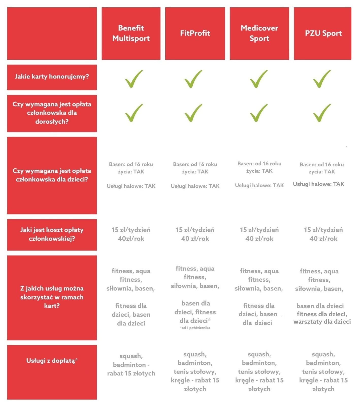 CentrumPrezentujemy zestawienie kart partnerskich, które honorowane są w naszym obiekcie. W zestawieniu można znaleźć informacje o usługach jakie wchodzą w ich skład oraz o ewentualnych dodatkowych opłatach z nimi związanych.